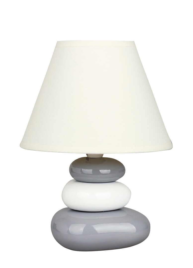 Keramický podstavec má šedo-bílou barvu, textilní stínidlo je krémové.