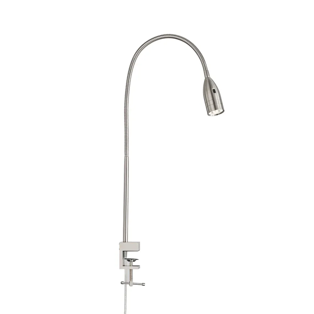 Tato stříbrná lampa v matném niklu s husím krkem a bezdotykovým stmívačem umístěným přímo na svítidle přináší do vašeho interiéru stylový a moderní prvek. Díky svému kompaktnímu designu se skvěle hodí k pracovnímu stolu do kanceláře, nebo dětskému psacímu stolu.